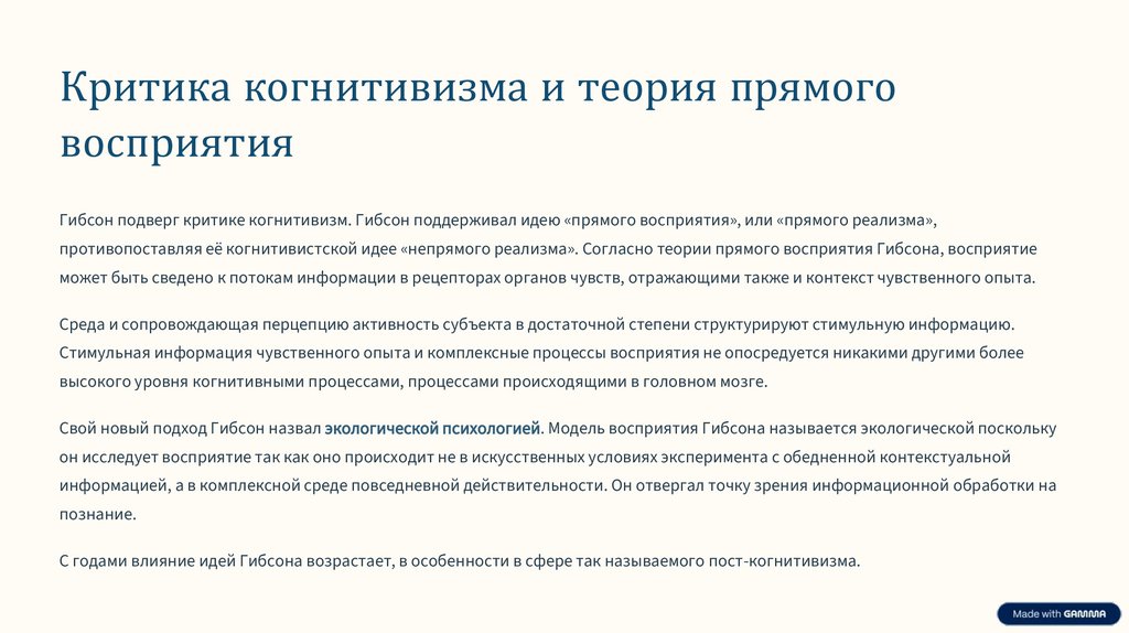 противопоставляя её когнитивистской идее «непрямого реализма». Согласно теории прямого восприятия Гибсона, восприятие