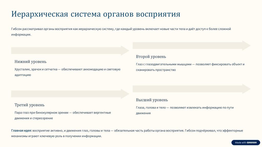 Иерархическая система органов восприятияГибсон рассматривал органы восприятия как иерархическую систему, где каждый уровень включает новые части тела и даёт доступ к более сложной