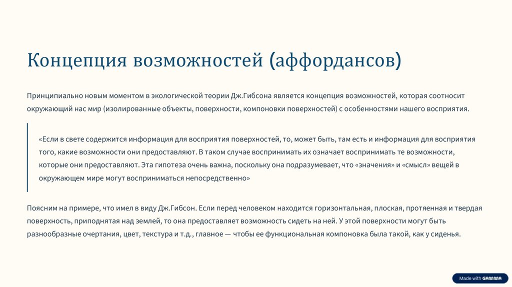 Концепция возможностей (аффордансов)Принципиально новым моментом в экологической теории Дж.Гибсона является концепция возможностей, которая соотносит