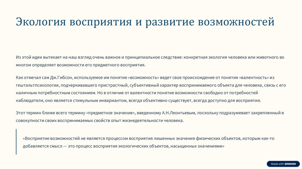 «Восприятие возможностей не является процессом восприятия лишенных значения физических объектов, которым как-то