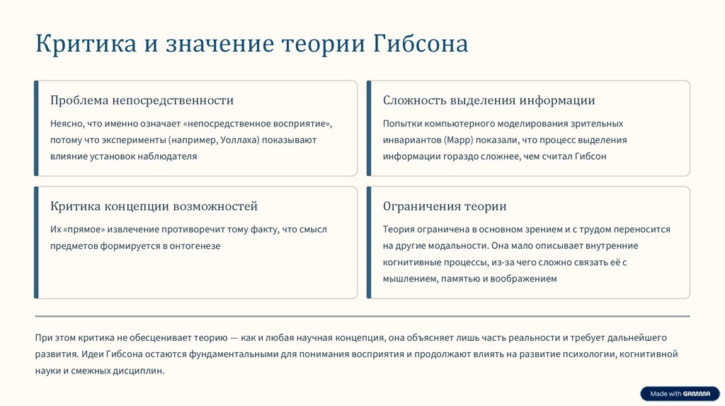 развития. Идеи Гибсона остаются фундаментальными для понимания восприятия и продолжают влиять на развитие психологии, когнитивной