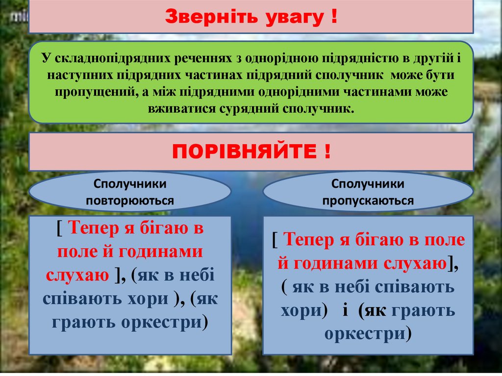 Зверніть увагу !У складнопідрядних реченнях з однорідною підрядністю в другій і