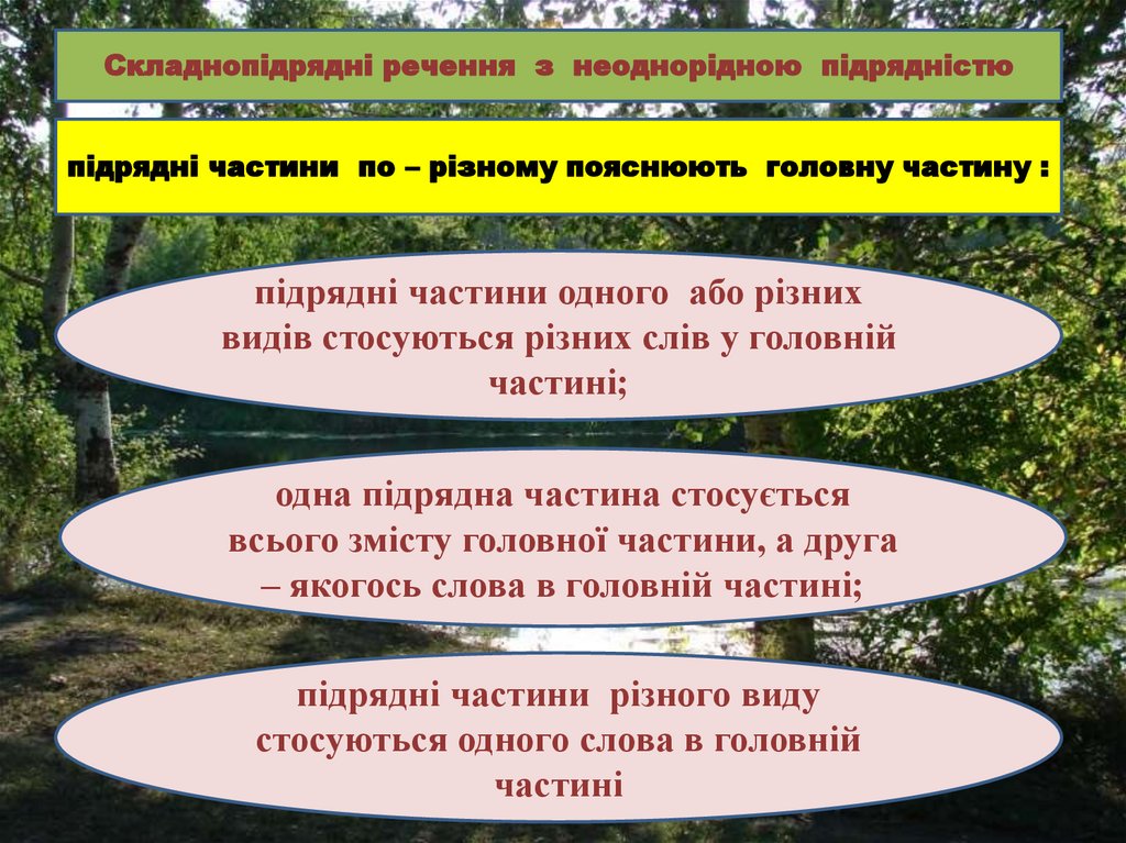 Складнопідрядні речення з неоднорідною підрядністюпідрядні частини по – різному пояснюють головну частину :