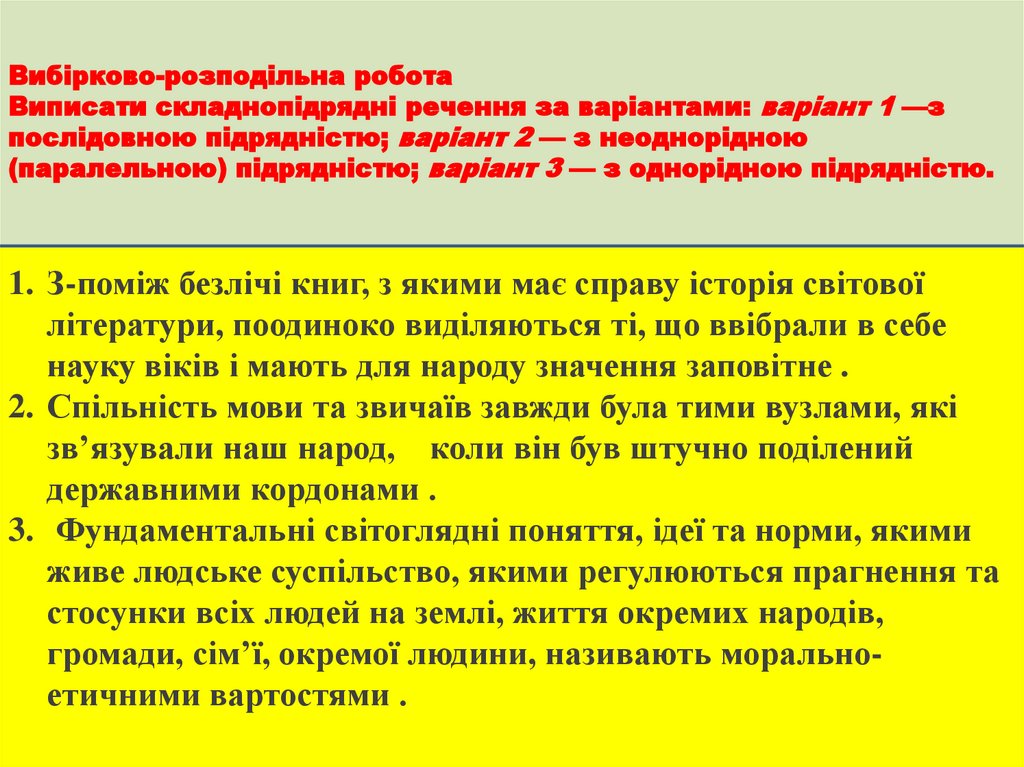 Вибірково-розподільна роботаВиписати складнопідрядні речення за варіантами: варіант 1 —з
