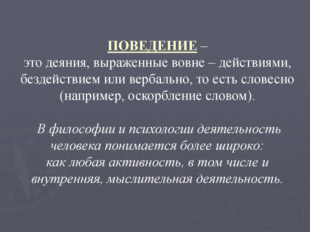 ПОВЕДЕНИЕ –это деяния, выраженные вовне – действиями,