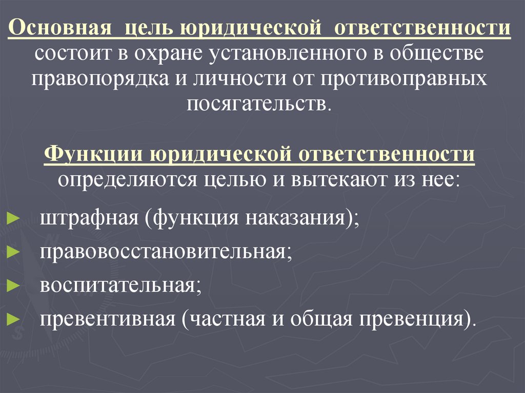 39. Основная цель юридической ответственности состоит в охране установленного в обществе правопорядка и личности от противоправных