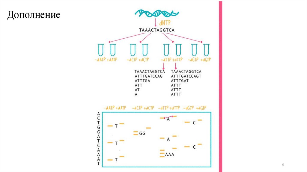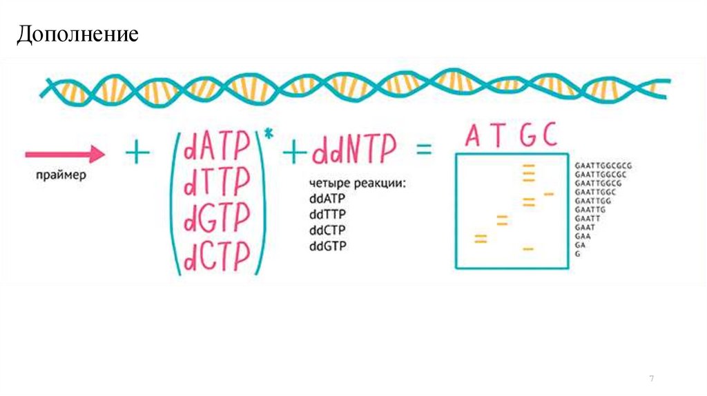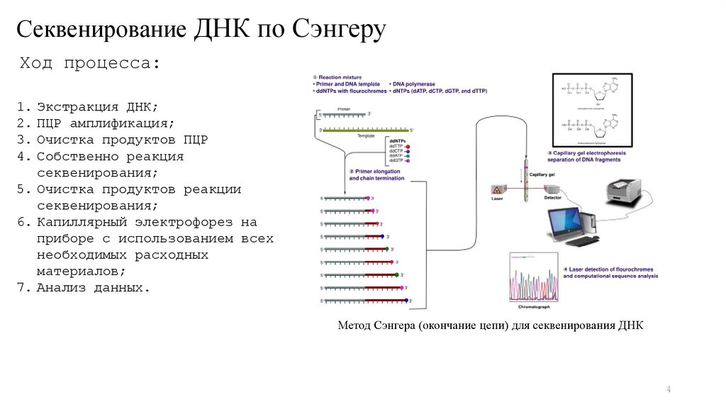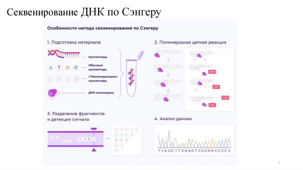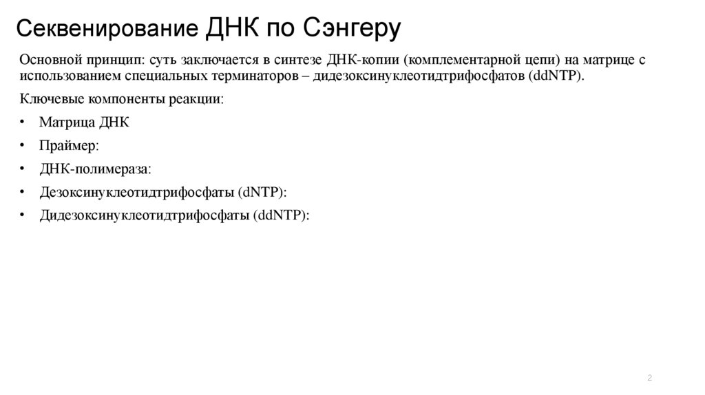 Секвенирование ДНК по СэнгеруОсновной принцип: суть заключается в синтезе ДНК-копии (комплементарной цепи) на матрице с