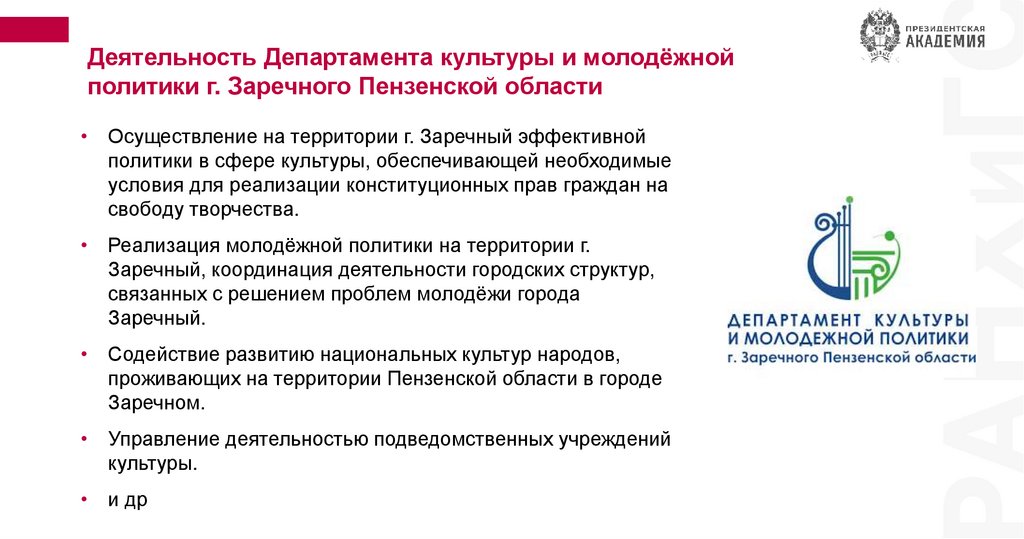 Деятельность Департамента культуры и молодёжнойполитики г. Заречного Пензенской области