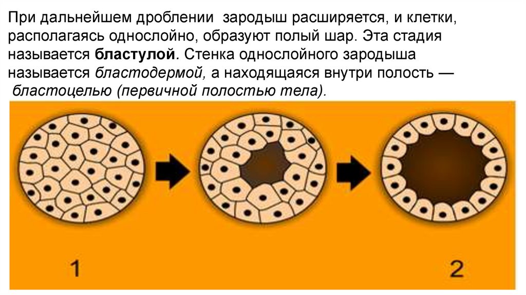 При дальнейшем дроблении зародыш расширяется, и клетки,располагаясь однослойно, образуют полый шар. Эта стадия