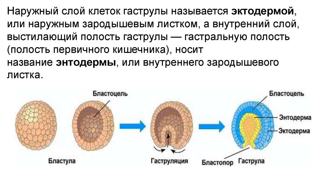Наружный слой клеток гаструлы называется эктодермой,или наружным зародышевым листком, а внутренний слой,
