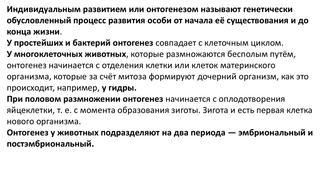 Индивидуальным развитием или онтогенезом называют генетическиобусловленный процесс развития особи от начала её существования и до