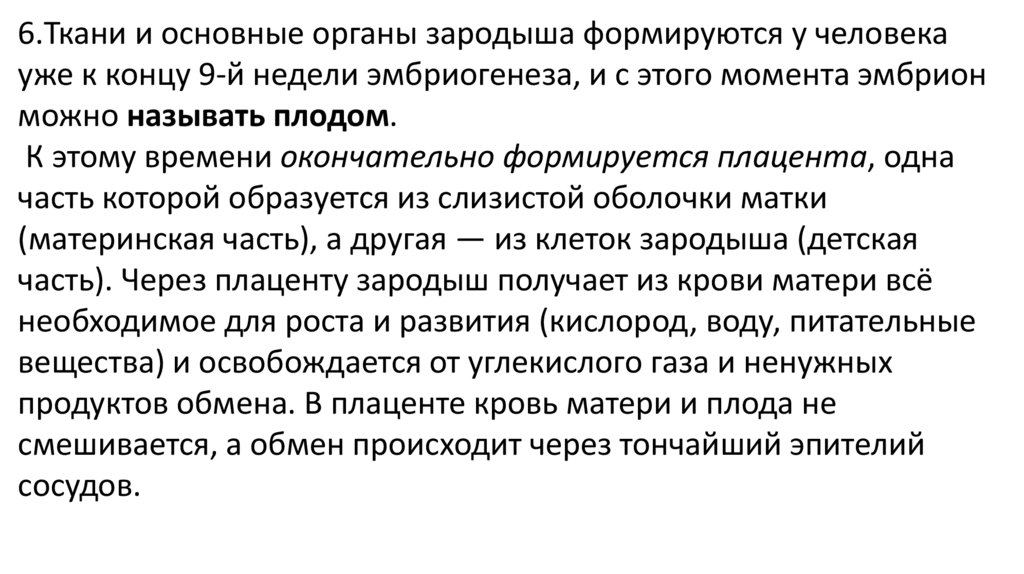 6.Ткани и основные органы зародыша формируются у человекауже к концу 9-й недели эмбриогенеза, и с этого момента эмбрион