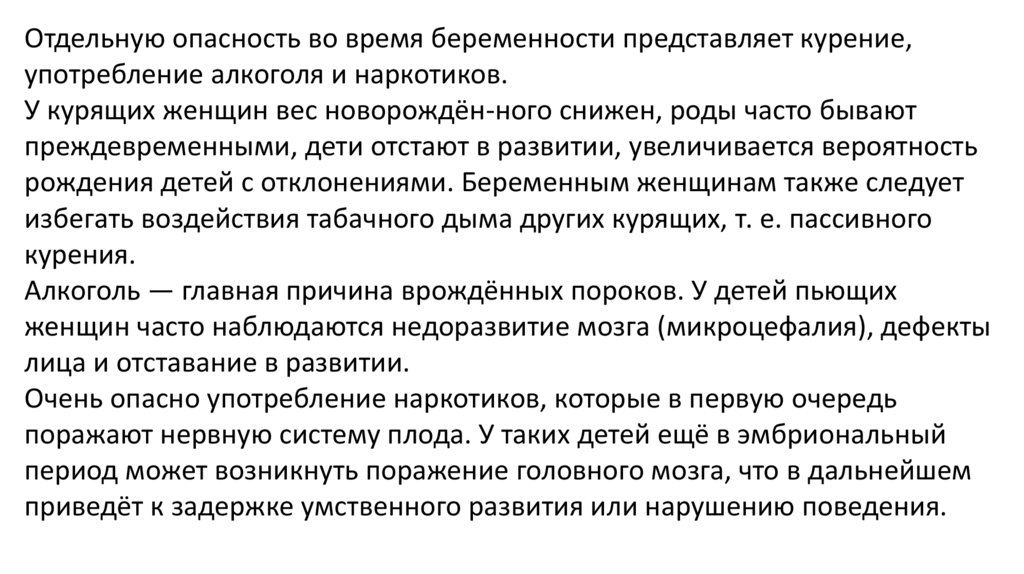 Отдельную опасность во время беременности представляет курение,употребление алкоголя и наркотиков.