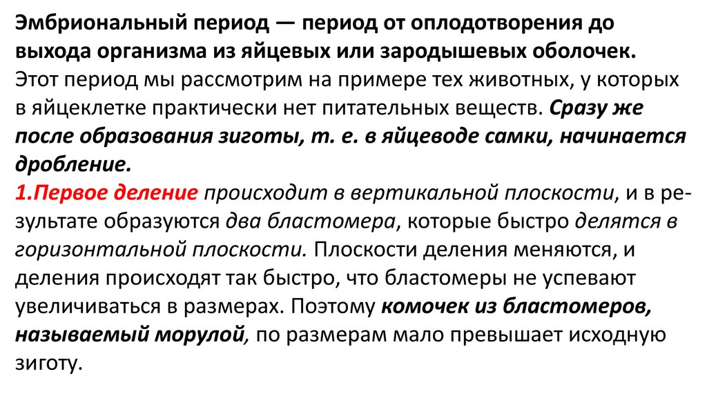 Эмбриональный период — период от оплодотворения довыхода организма из яйцевых или зародышевых оболочек.