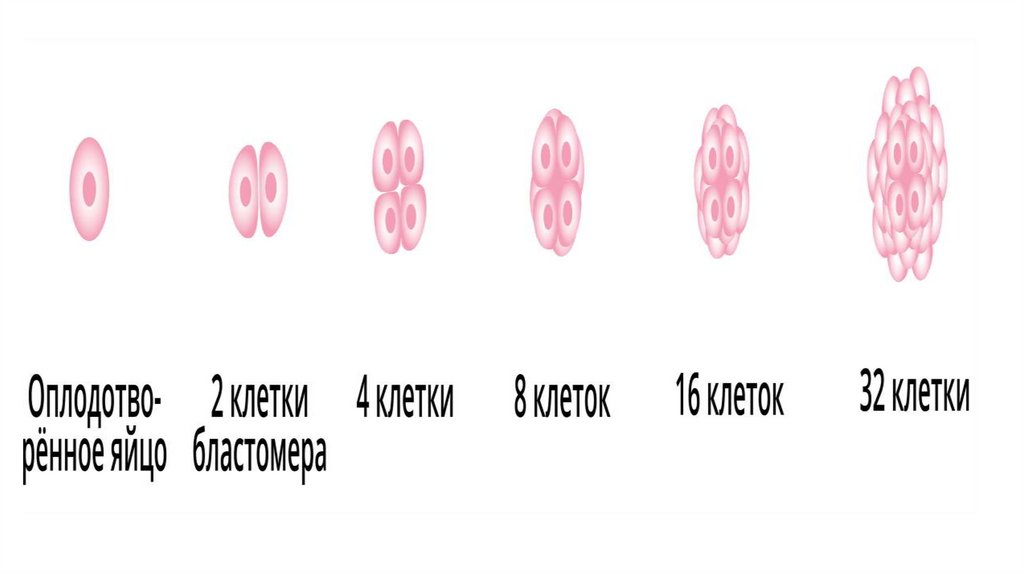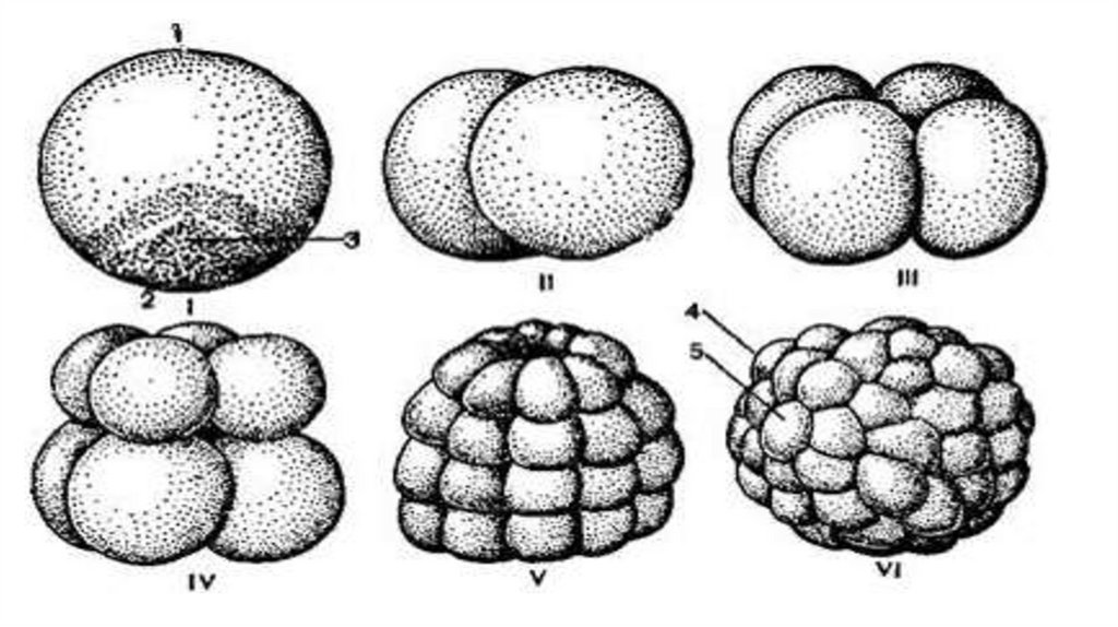 1.Первое деление происходит в вертикальной плоскости, и в результате образуются два бластомера, которые быстро делятся в