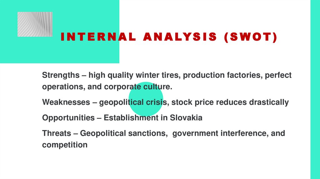 I N T E R N A L A N A LY S I S ( S W O T )Strengths – high quality winter tires, production factories, perfect
