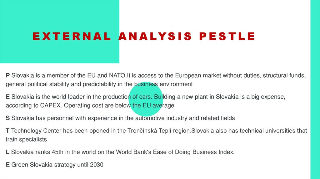 E X T E R N A L A N A LY S I S P E S T L EP Slovakia is a member of the EU and NATO.It is access to the European market without duties, structural funds,