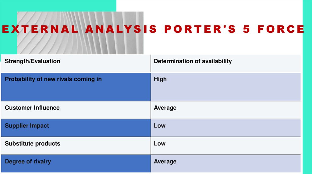 E X T E R N A L A N A LY S I S P O R T E R ' S 5 F O R C EStrength/Evaluation
