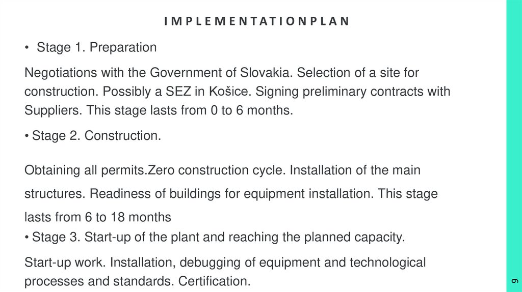 • Stage 3. Start-up of the plant and reaching the planned capacity.