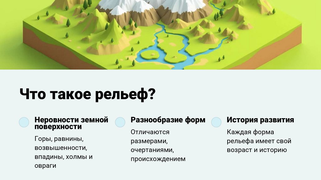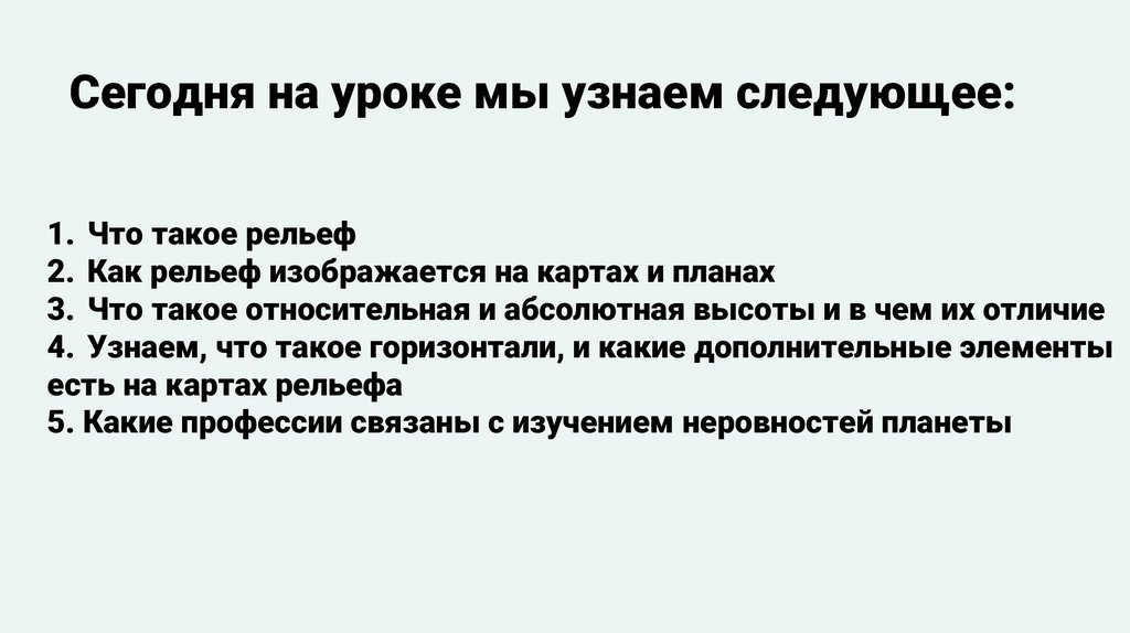 Сегодня на уроке мы узнаем следующее:1. Что такое рельеф