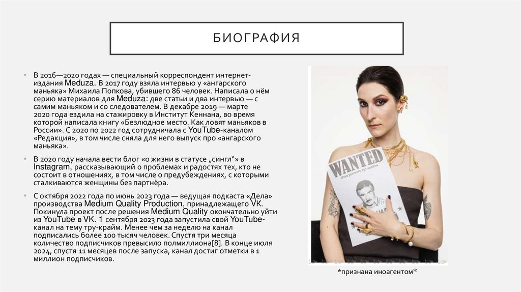 БИОГРАФИЯ• В 2016—2020 годах — специальный корреспондент интернетиздания Meduza. В 2017 году взяла интервью у «ангарского