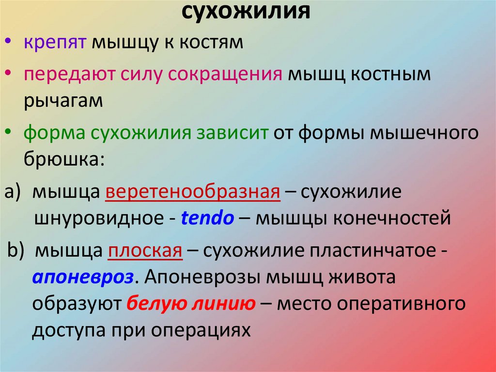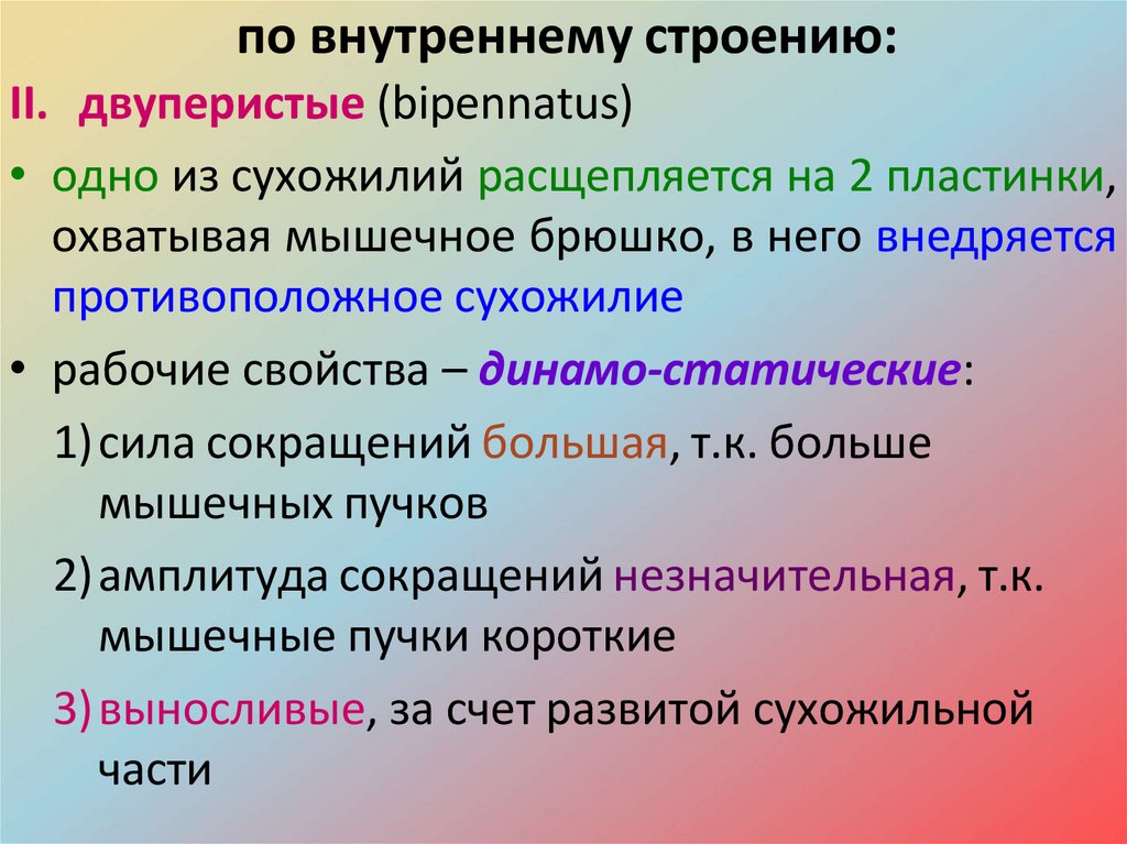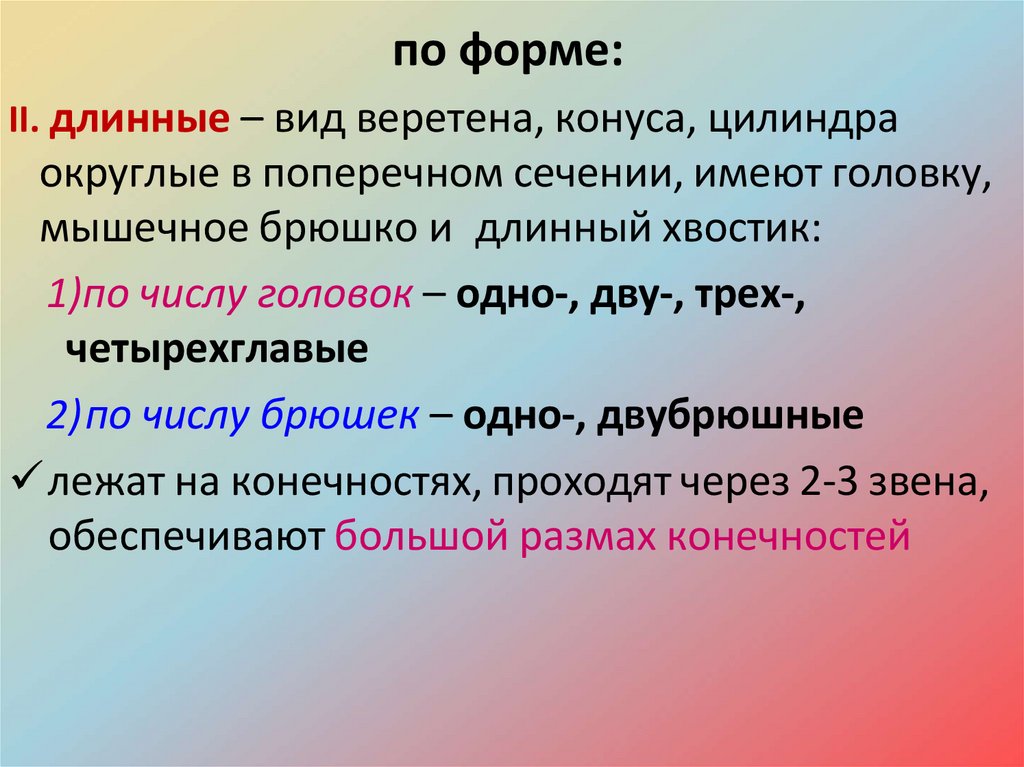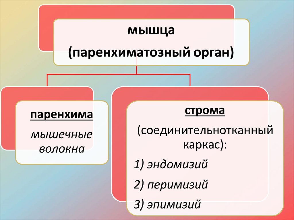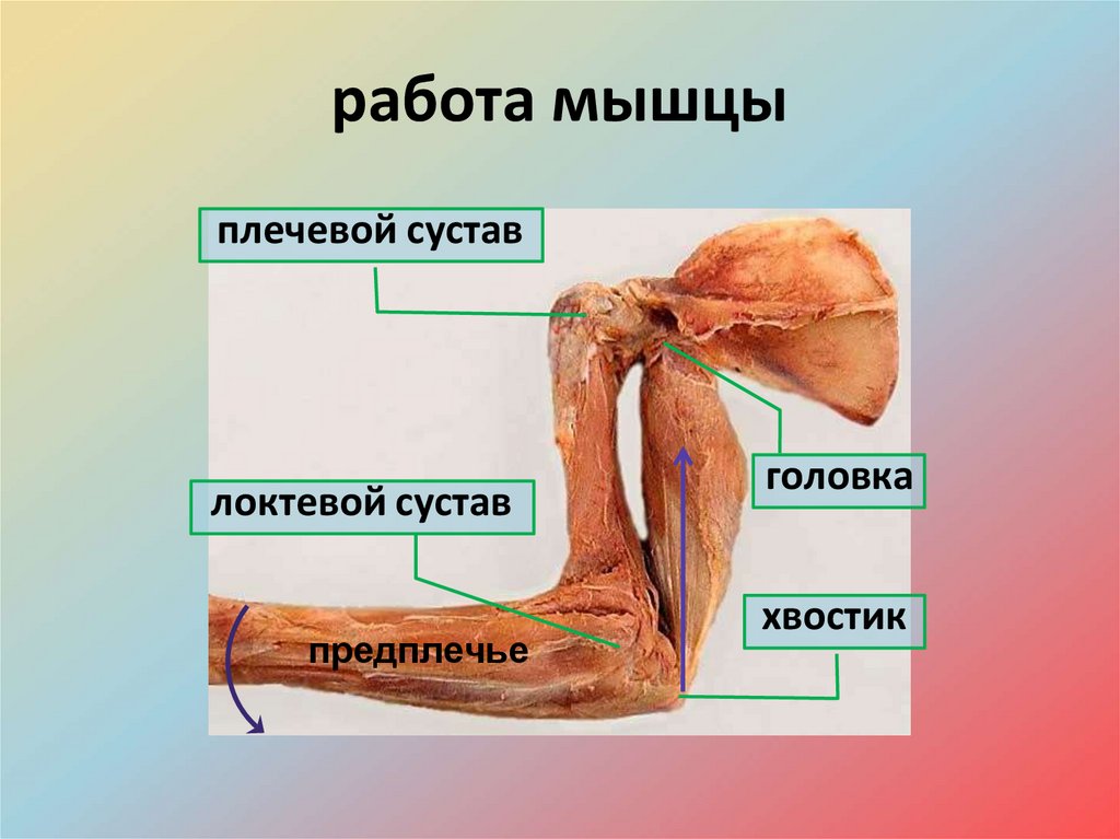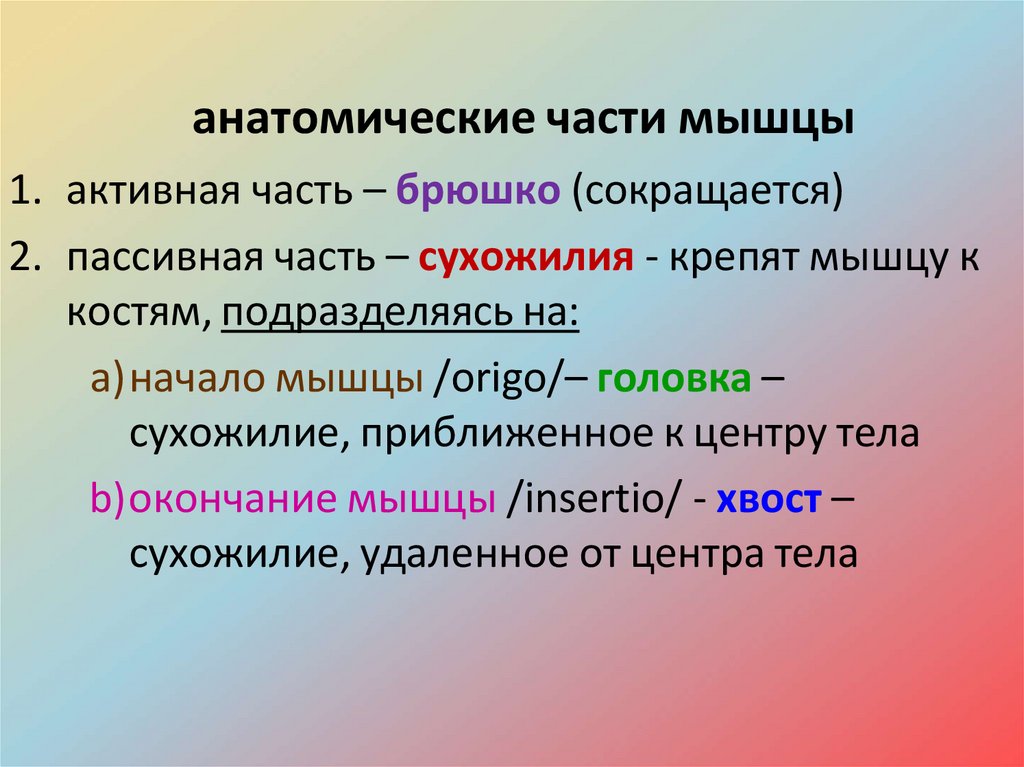 1. активная часть – брюшко (сокращается)2. пассивная часть – сухожилия - крепят мышцу к