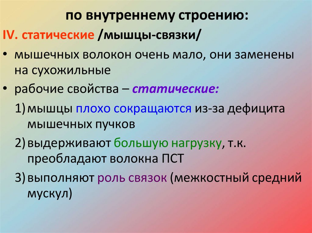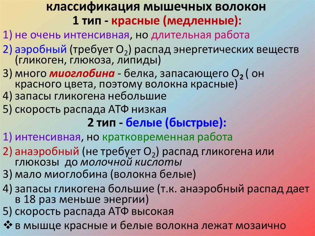 1 тип - красные (медленные):1) не очень интенсивная, но длительная работа