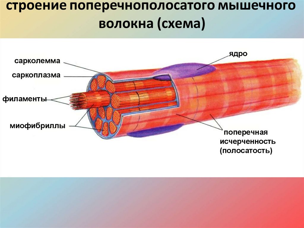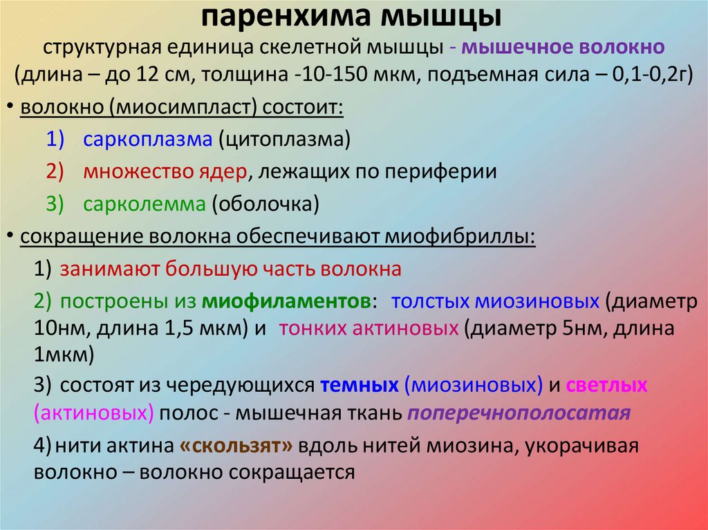 структурная единица скелетной мышцы - мышечное волокно(длина – до 12 см, толщина -10-150 мкм, подъемная сила – 0,1-0,2г)
