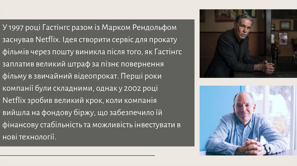 У 1997 році Гастінгс разом із Марком Рендольфомзаснував Netflix. Ідея створити сервіс для прокату