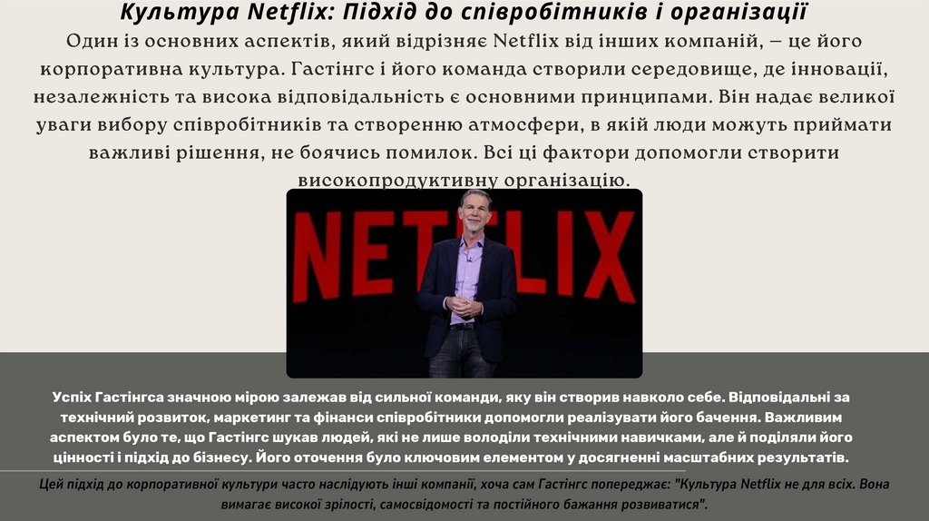 Культура Netflix: Підхід до співробітників і організаціїУспіх Гастінгса значною мірою залежав від сильної команди, яку він створив навколо себе. Відповідальні за