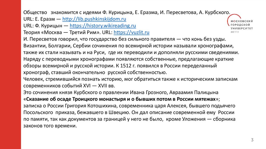 Обществознакомится с идеями Ф. Курицына, Е. Еразма, И. Пересветова, А. Курбского.