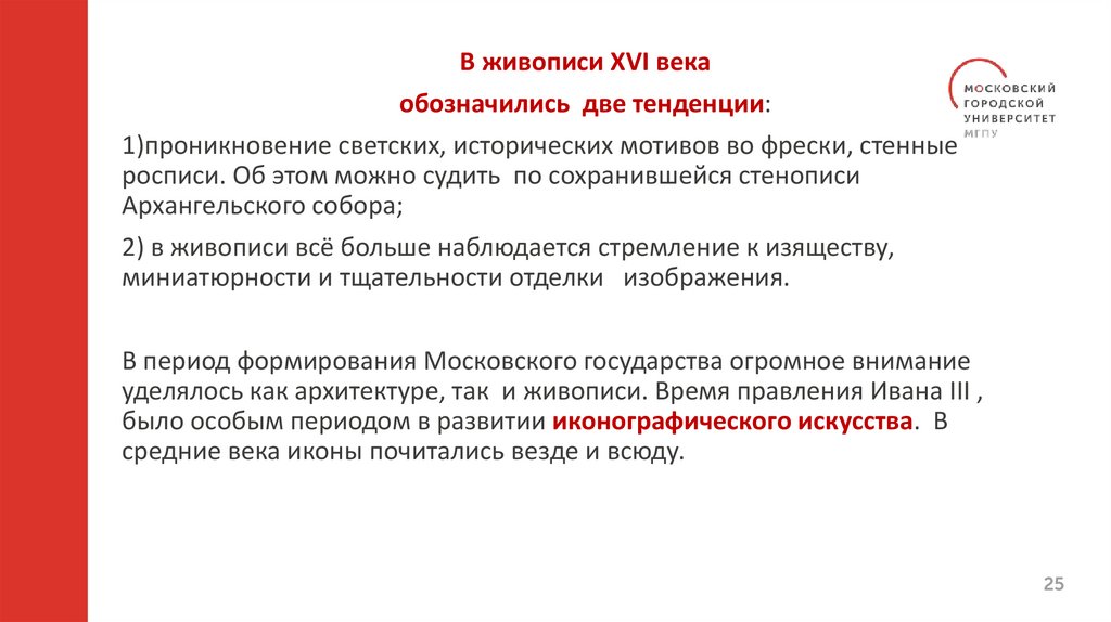 1)проникновение светских, исторических мотивов во фрески, стенные
