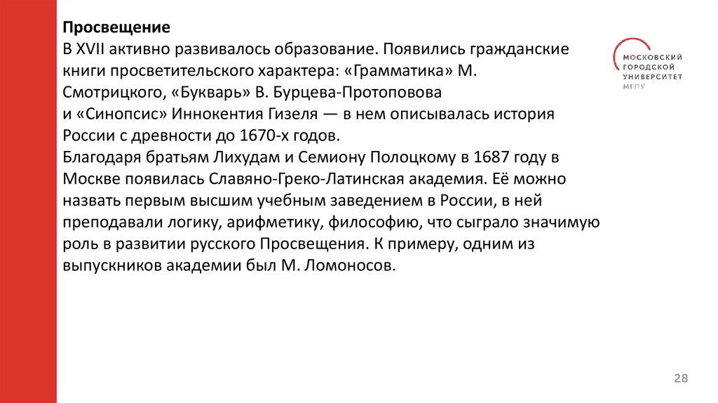 ПросвещениеВ XVII активно развивалось образование. Появились гражданские