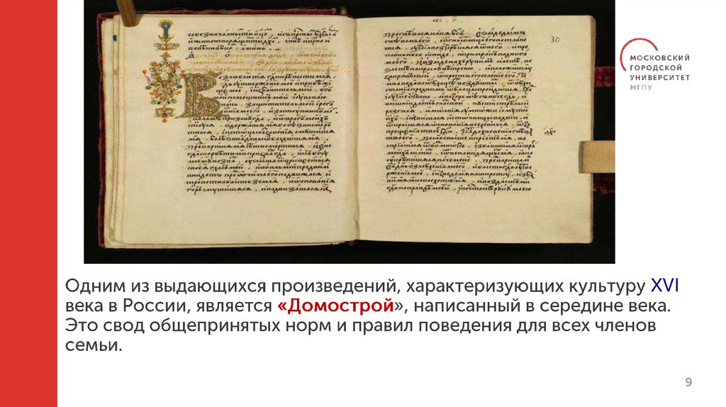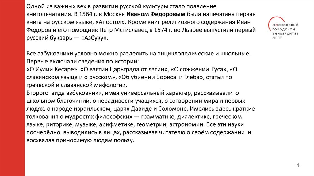 Одной из важных вех в развитии русской культуры стало появлениекнигопечатания.
