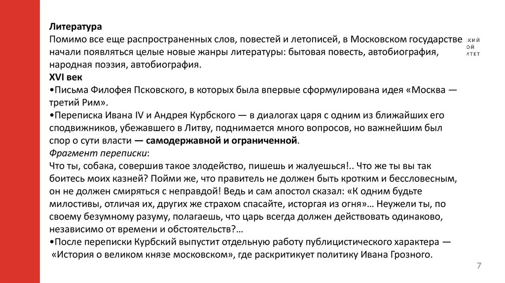 •Переписка Ивана IV и Андрея Курбского — в диалогах царя с одним из ближайших его