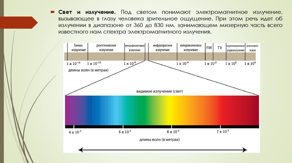 Свет и излучение. Под светом понимают электромагнитное излучение,вызывающее в глазу человека зрительное ощущение. При этом речь идет об