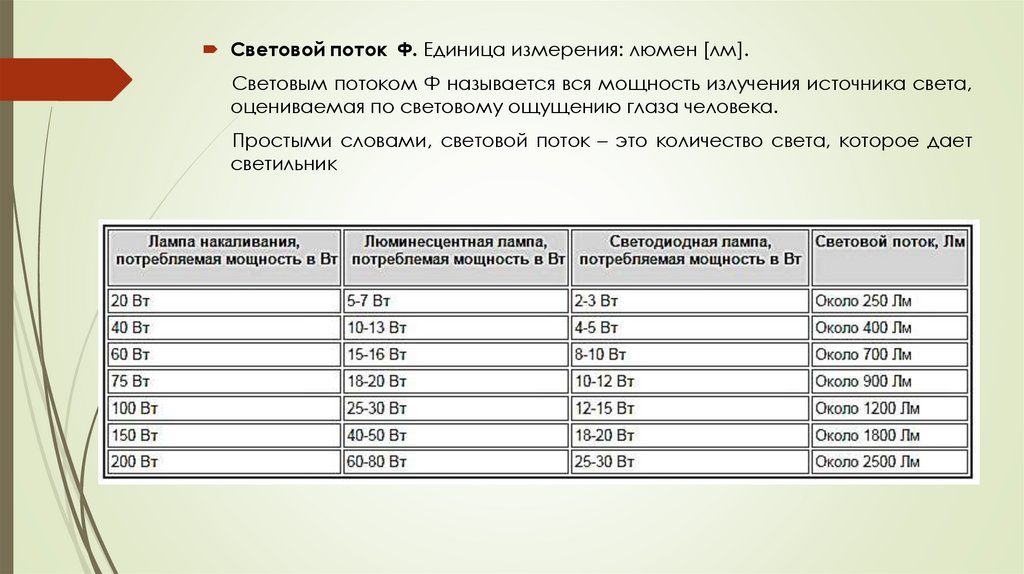 Световой поток Ф. Единица измерения: люмен [лм].Световым потоком Ф называется вся мощность излучения источника света,