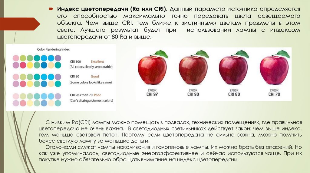 Индекс цветопередачи (Ra или CRI). Данный параметр источника определяетсяего способностью максимально точно передавать цвета освещаемого