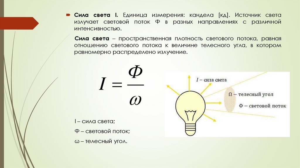 Сила света I. Единица измерения: кандела [кд]. Источник светаизлучает световой поток Ф в разных направлениях с различной
