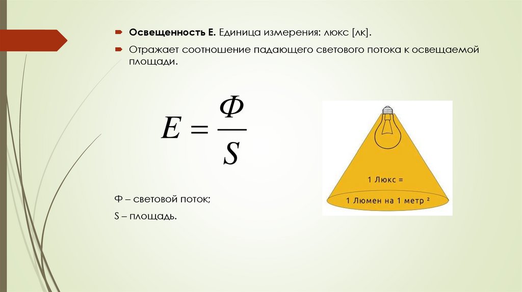 Освещенность Е. Единица измерения: люкс [лк].Отражает соотношение падающего светового потока к освещаемой