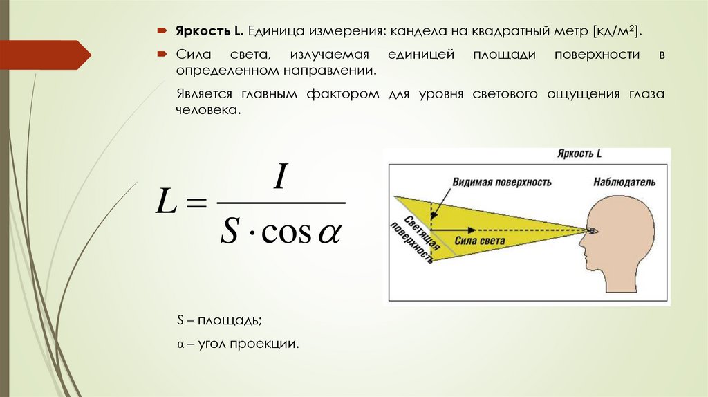 Яркость L. Единица измерения: кандела на квадратный метр [кд/м2].Сила света, излучаемая единицей