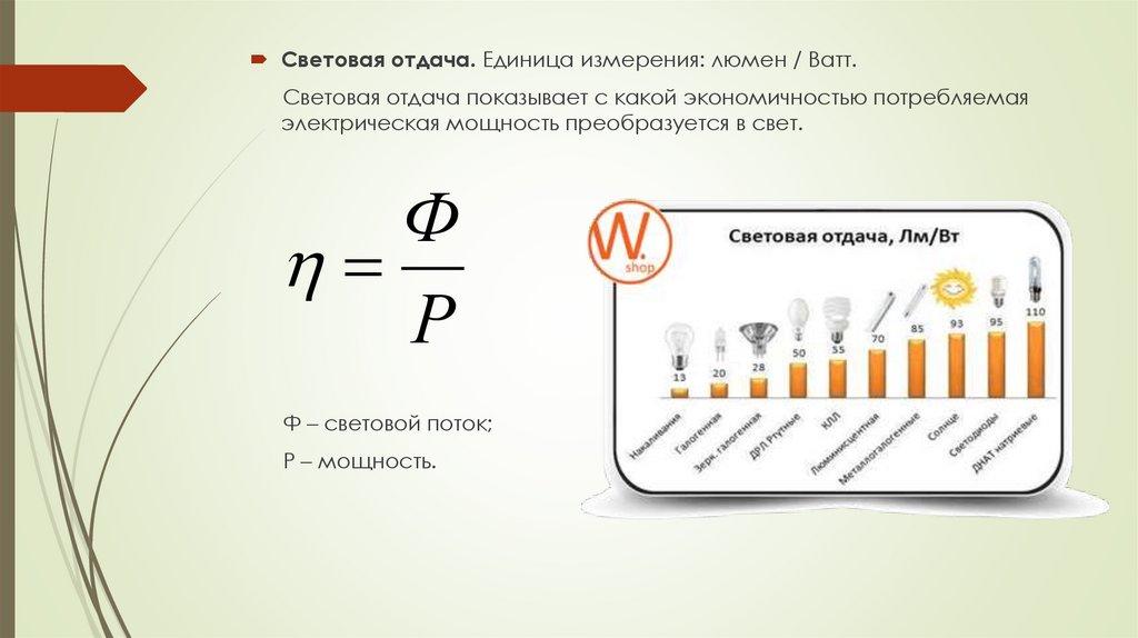 Световая отдача. Единица измерения: люмен / Ватт.Световая отдача показывает с какой экономичностью потребляемая
