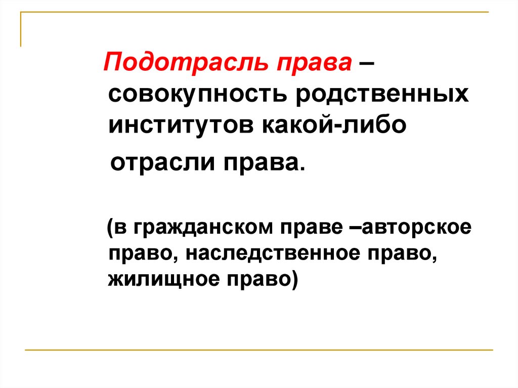 Подотрасль права –совокупность родственных
