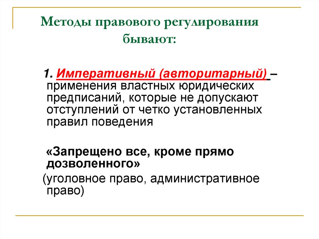 1. Императивный (авторитарный) –применения властных юридических