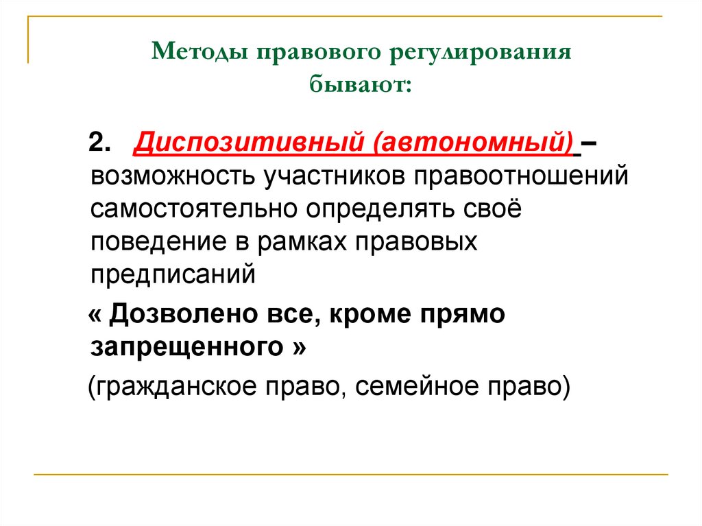 2. Диспозитивный (автономный) –возможность участников правоотношений
