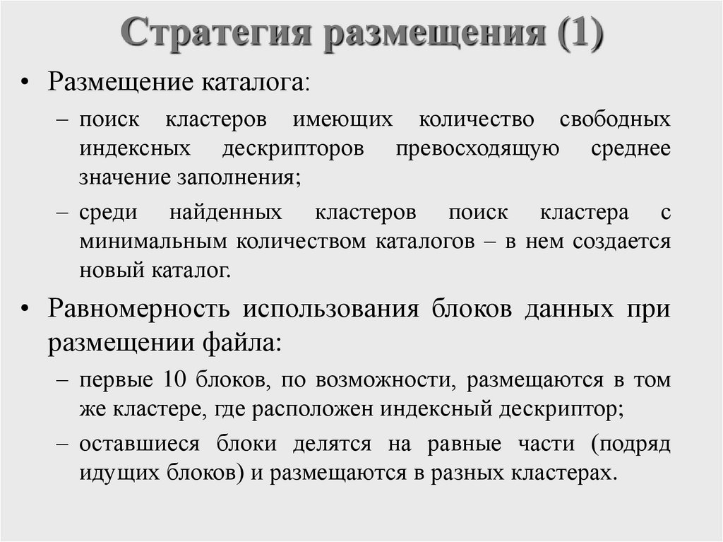 • Размещение каталога:– поиск кластеров имеющих количество свободных
