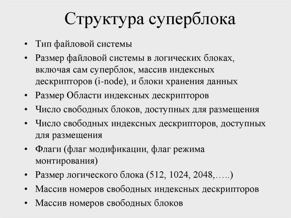 • Тип файловой системы• Размер файловой системы в логических блоках,