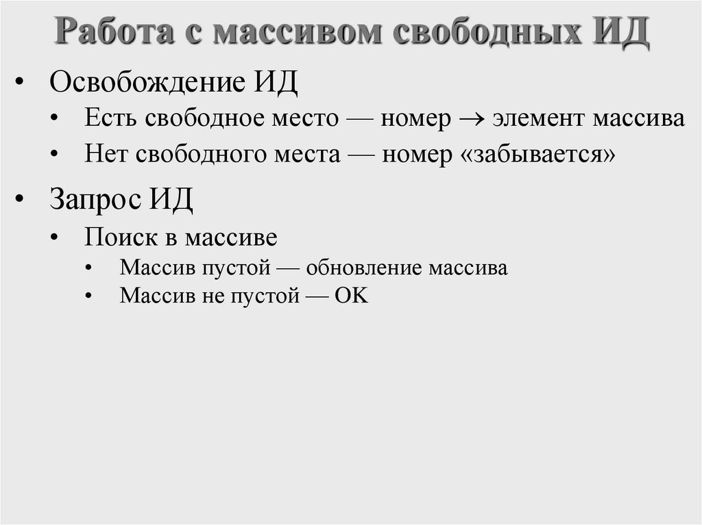 • Освобождение ИД• Есть свободное место — номер элемент массива