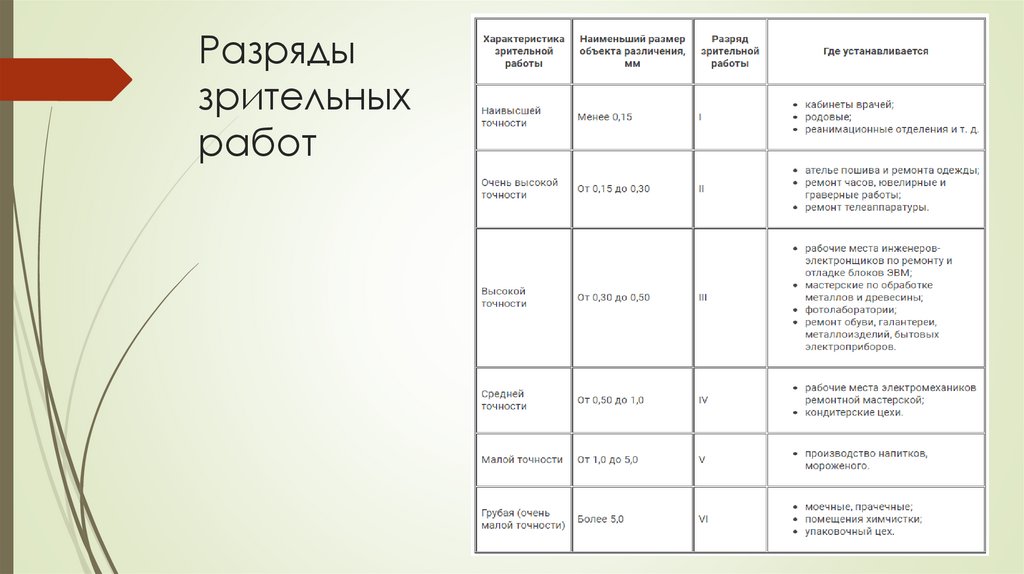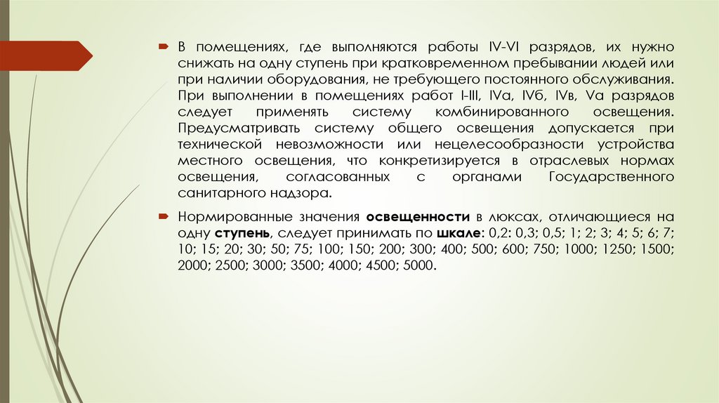 В помещениях, где выполняются работы IV-VI разрядов, их нужноснижать на одну ступень при кратковременном пребывании людей или