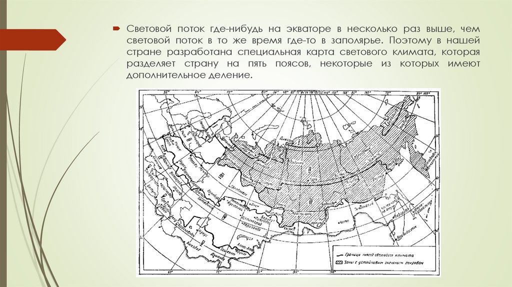 Световой поток где-нибудь на экваторе в несколько раз выше, чемсветовой поток в то же время где-то в заполярье. Поэтому в нашей
